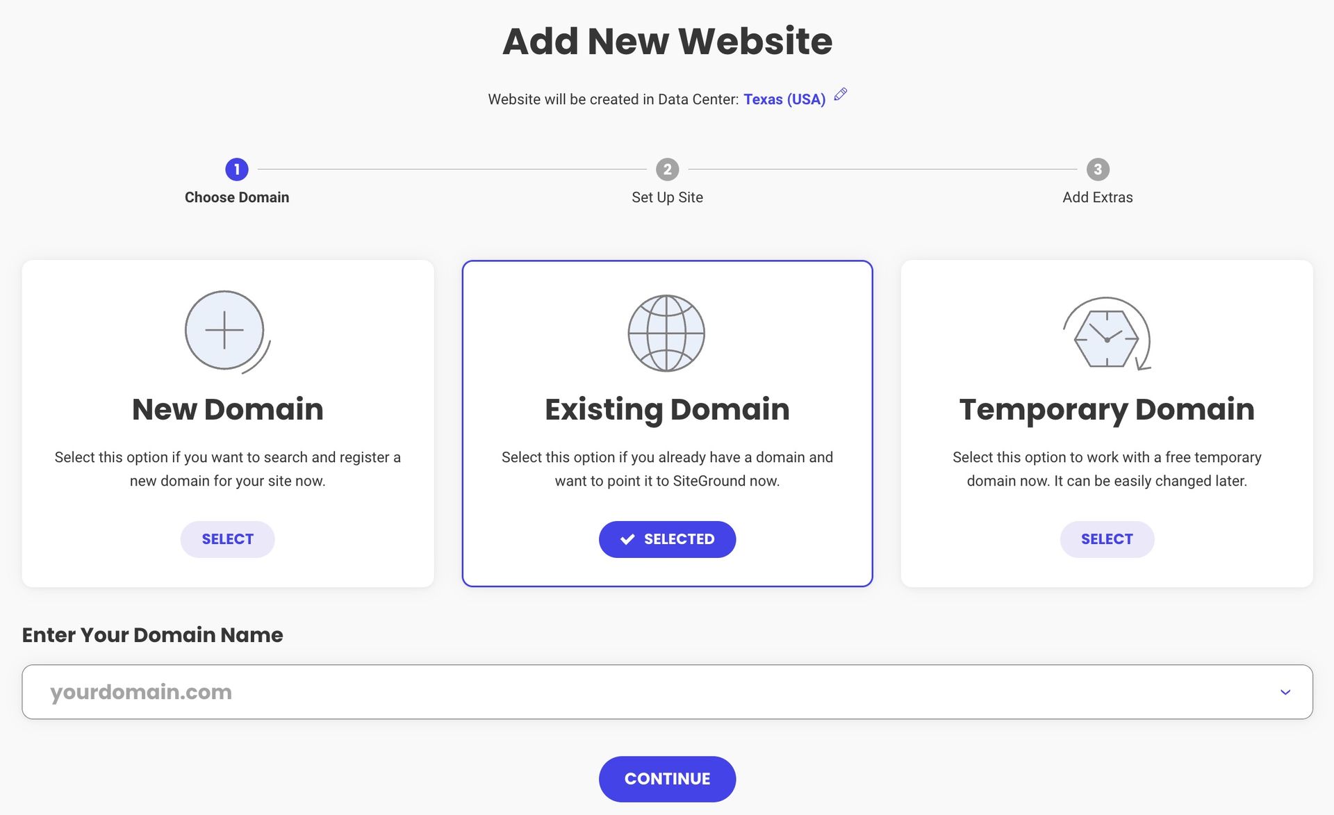 Para crear un sitio web, es necesario partir asociando un dominio. En caso de ya existir el dominio, se deben actualizar los registros DNS. En caso de no tener un dominio, no es recomendable adquirirlo a través de Siteground (utilizar nic.l o domain.com).