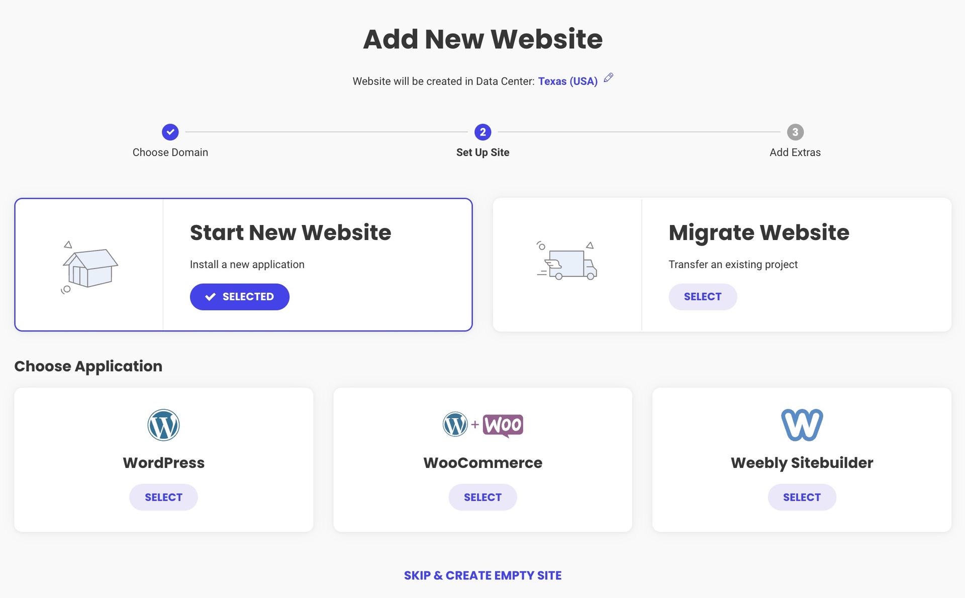 Si vamos a crear un sitio desde 0, seleccionamos Start New Website. Luego la configuración dependiendo del tipo de producto: